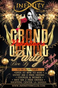 Feiere das Grand Opening im Infinity SW Club mit einer exklusiven Valentine’s Party. Zwei Nächte voller Glamour, Live DJ und prickelnder Stimmung. Paare und Frauen zahlen 20 € inklusive zwei Drinks, Männer 50 € inklusive zwei Drinks. Die Party findet im Shopping Center La Sandia statt.